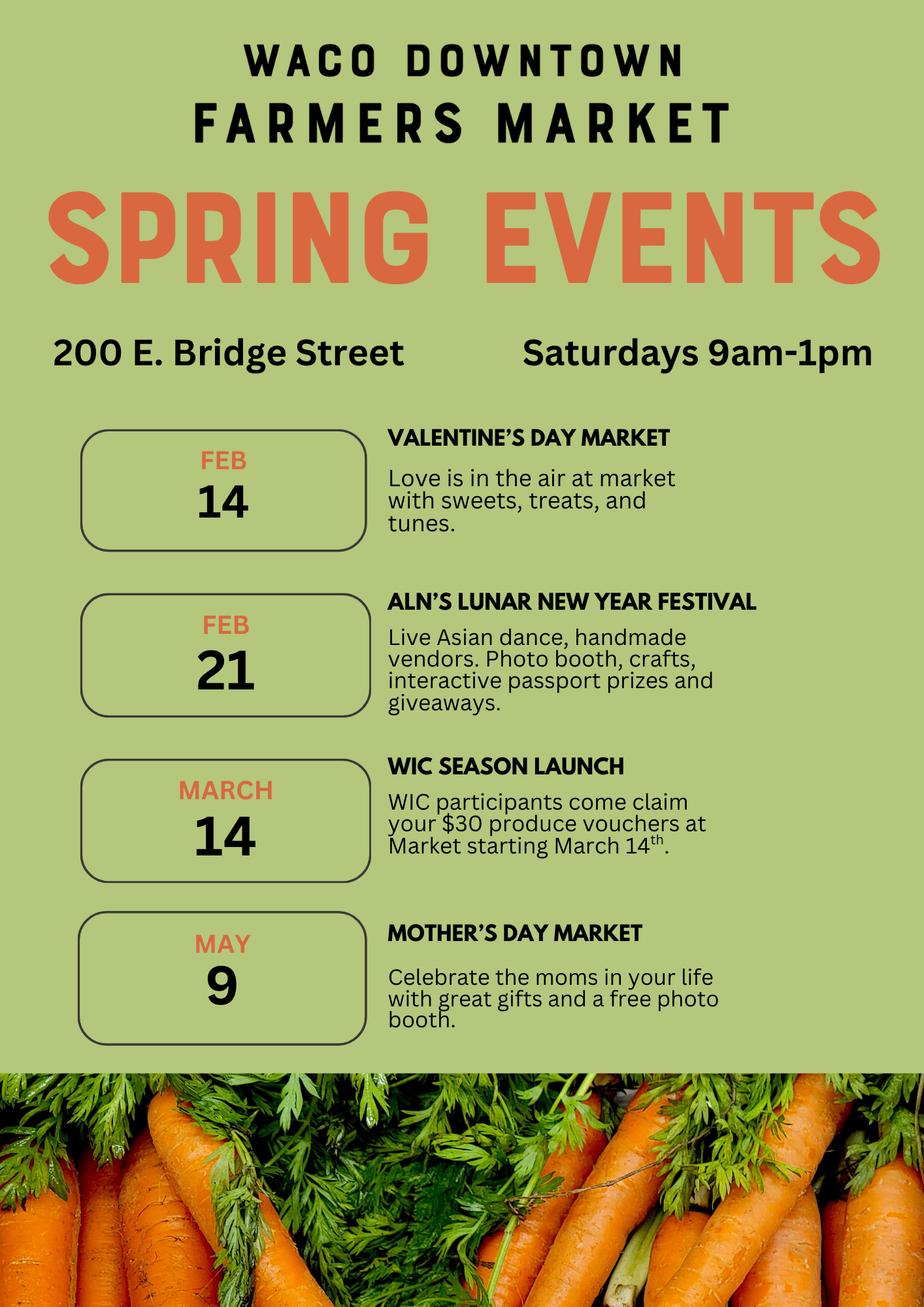 The Waco Downtown Farmers Market is open every Saturday year-round from 9am to 1pm featuring the best local agricultural producers and artisan vendors within 150-miles of Waco. Join us for a whole morning of fun - including free weekly wellness activities and live entertainment. Don’t forget your picnic blanket. See you Saturday!